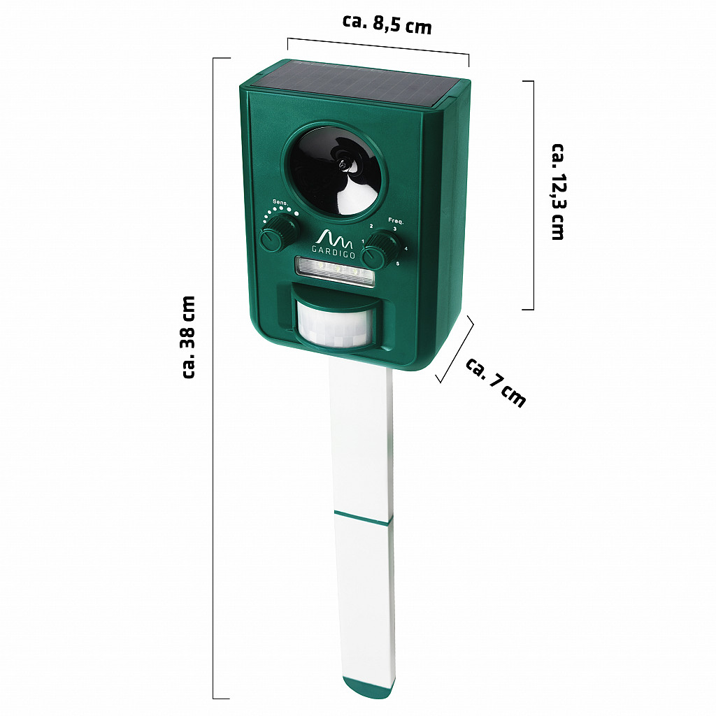 Damit Sie Probleme mit den verschiedensten Tieren ganz gezielt lösen können, hat der Solar Tier-Vertreiber einen einstellbaren Frequenz- und Sensorbereich. Die Ultraschall-Frequenzen zur Tierabwehr sind so hoch, dass Menschen sie in der Regel nicht hören können.